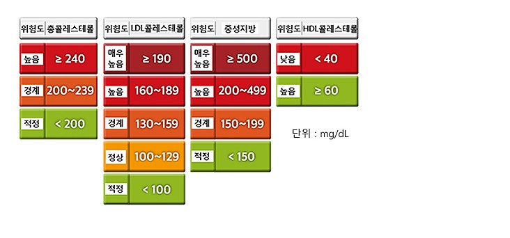 *최근에는 총콜레스테롤 보다는 LDL이 나쁜 놈이라고 규정하고 LDL을 기준으로 100이하가 적절하다고 봅니다. 130 넘으면 경계, 160 넘으면 약물치료를 권하고 있습니다. 위험요인이 얼마나 많은가에 따라서 초고위험군은 70이하로 낮추기 위해 고지혈증약을 쓰기도 합니다. 중성지방은 150이하, HDL 콜레스테롤은 40~60을 유지하도록 권고하고 있습니다.